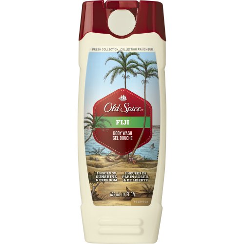 Old Spice Fiji body wash keeps skin feeling smooth and hydrated*, with a scent that reminds shower-ers of a beachside resort where the drinks are free and the sand helps fight dirt and odor. *vs. bar soap